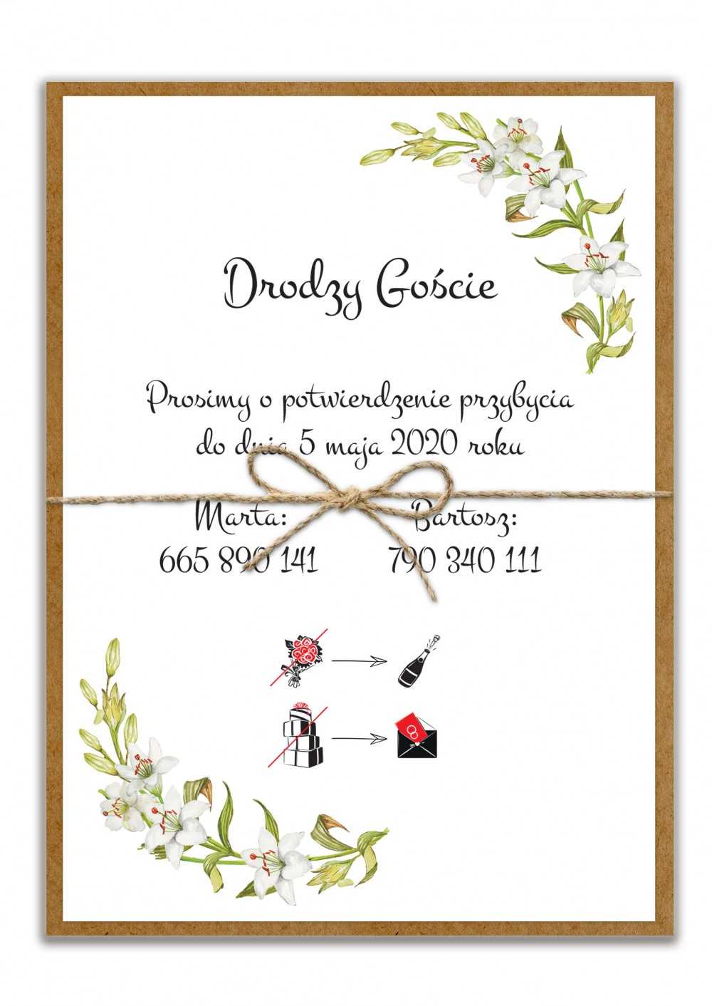 Zaproszenia idealna na uroczystość ślubną i weselną. Zestaw składa się z jednej karty w formacie A5 - zaproszenie oraz wkładki w formacie A6 - potwierdzenie. Zestaw na podklejce ze sztywnego kartonu kraft.