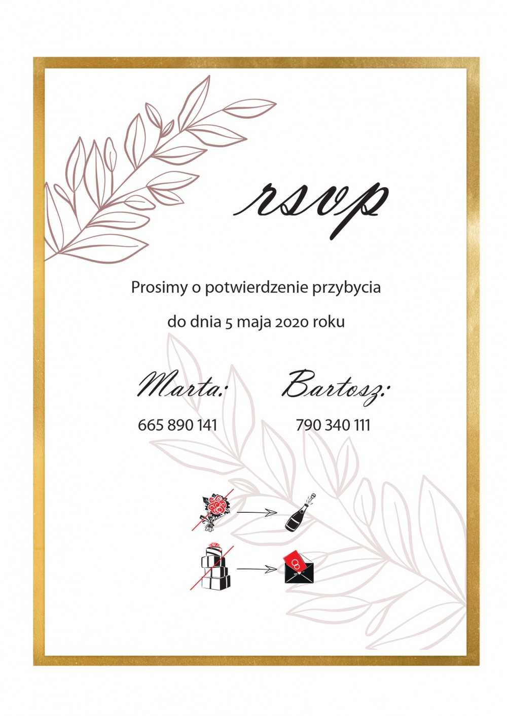 Zaproszenia idealna na uroczystość ślubną i weselną. Zestaw składa się z jednej karty w formacie A5 - zaproszenie oraz wkładki w formacie A6 - potwierdzenie. Zestaw na podklejce ze sztywnego kartonu złotego.