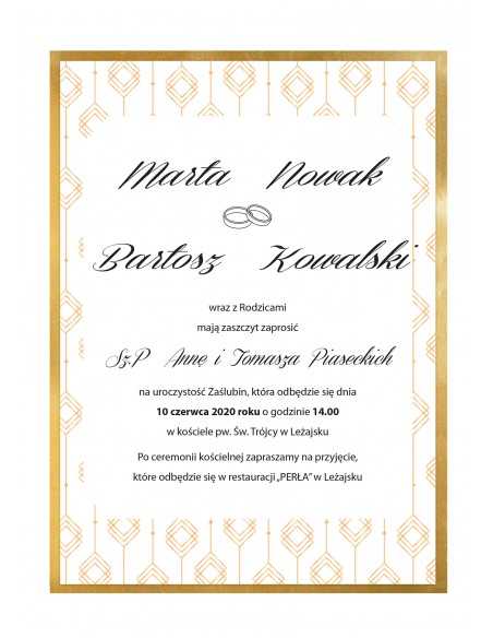 Zaproszenia idealna na uroczystość ślubną i weselną. Zestaw składa się z jednej karty w formacie A5 - zaproszenie oraz wkładki w formacie A6 - potwierdzenie. Zestaw na podklejce ze sztywnego kartonu złotego.